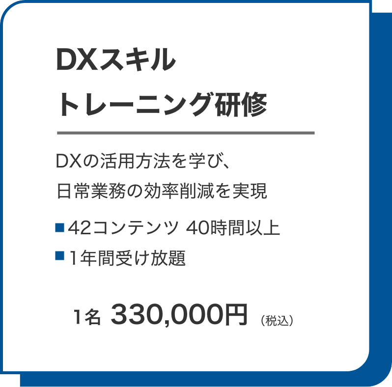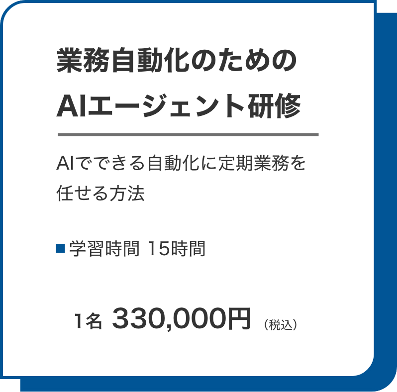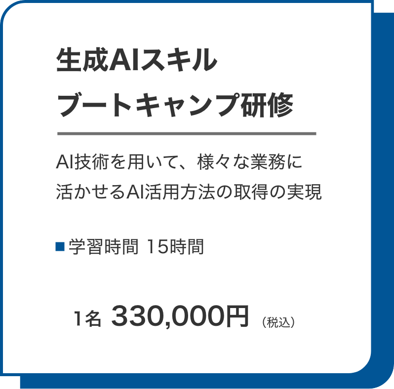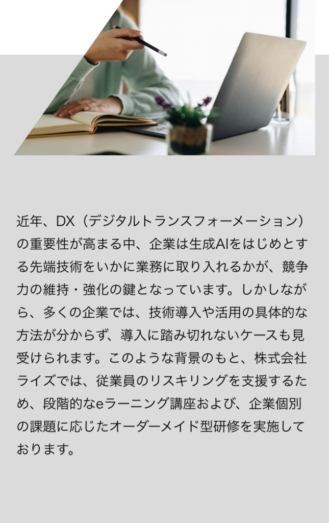 コース内容 Corse 研修内容 AIを駆使した人材育成研修 近年、DX(デジタルトランスフォーメーション)の重要性が高まる中、企業は生成AIをはじめとする先端技術をいかに業務に取り入れるかが、競争力の維持・強化の鍵となっています。しかしながら、多くの企業では、技術導入や活用の具体的な方法が分からず、導入に踏み切れないケースも見受けられます。このような背景のもと、株式会社ライズでは、従業員のリスキリングを支援するため、段階的なeラーニング講座および、企業個別の課題に応じたオーダーメイド型研修を実施しております。 Corse 講座内容